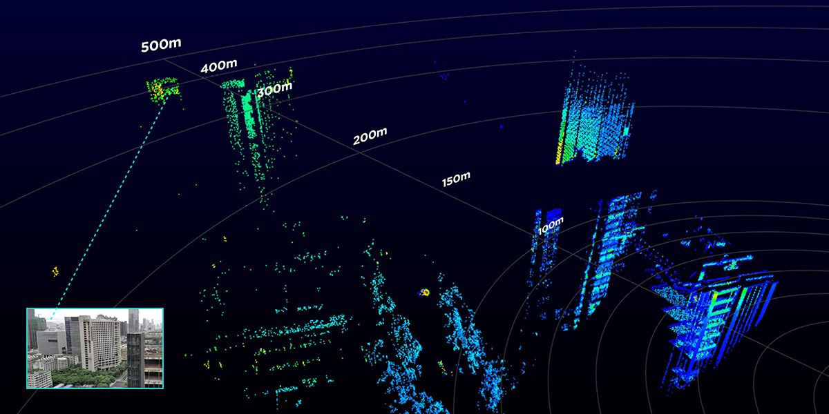従来のLiDARとは異なる非反復走査技術により、短時間で広いエリアの点群データ取得に対応できる点が大きな特長です。これにより、複雑な地形や構造物に対しても、効率的かつ均一性の高い3Dデータを取得できます。さらに、複数の反射情報を取得できる設計により、植生や障害物が混在する環境でも、対象物を正確に把握することが可能です。