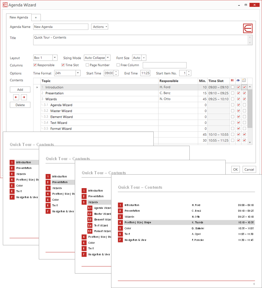 時間配分やページ番号の自動計算、サブ項目の折りたたみ、スライド順の自動調整などに対応し、わかりやすく整ったプレゼン資料を簡単に作成できます。
