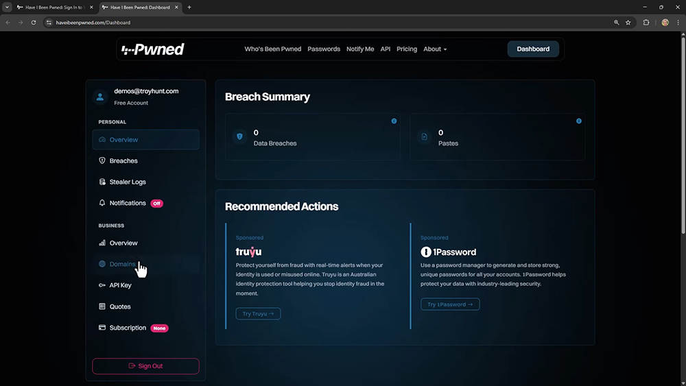 Have I Been Pwned / HIBP / HIBP サブスクリプション / HIBP API / データ侵害 検索 / ドメイン漏洩 監視 / アカウント侵害 照会 / Stealer Logs 検索 / パスワード漏洩 照合 / メールアドレス 侵害履歴 / セキュリティ監視 自動化 / 侵害データ API 連携 / ドメイン一括検索 / 情報漏洩 照会サービス / 組織ドメイン 監視 / 露出状況 可視化 / 大規模アカウント監視 / 侵害通知 サービス / セキュリティ運用 最適化 / データ侵害 インテリジェンス