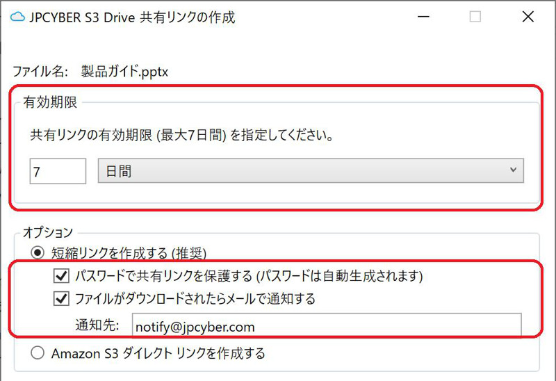 リンクには有効期限、パスワード、ダウンロード通知メールが設定でき、