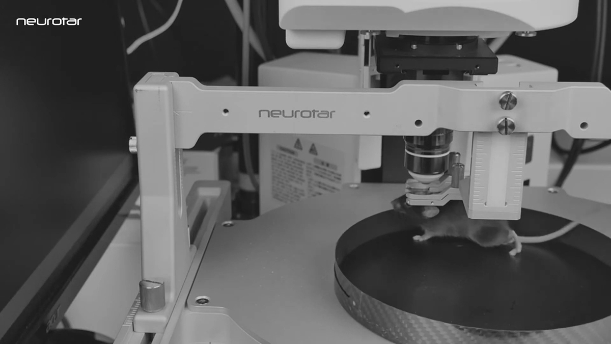 本製品の最大の特長は、高い頭部安定性と自由度の高い行動環境を両立している点にあります。これにより、多光子顕微鏡イメージング、電気生理記録、光刺激、機能的超音波計測など、さまざまな測定手法を覚醒下で統合的に実施できます。また、ロコモーション情報の取得や外部刺激との同期にも対応しており、行動と脳機能の相関解析を高精度に行えます。