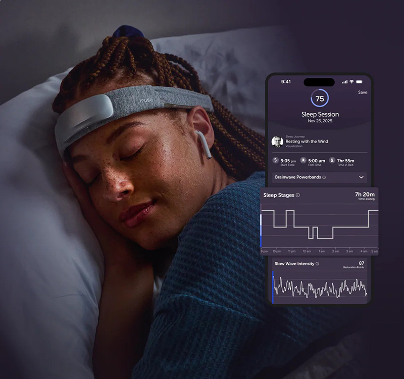 取得されたデータは専用のMuseアプリと連携し、集中、ストレス、回復、睡眠といった状態として可視化。これにより、ユーザーは脳と身体の状態を一時的な感覚ではなく、データに基づいて把握できます。また、睡眠中も装着したまま使用でき、浅い睡眠、深い睡眠、REM睡眠などの睡眠ステージや夜間の動きを記録し、休息の状態を確認できます。