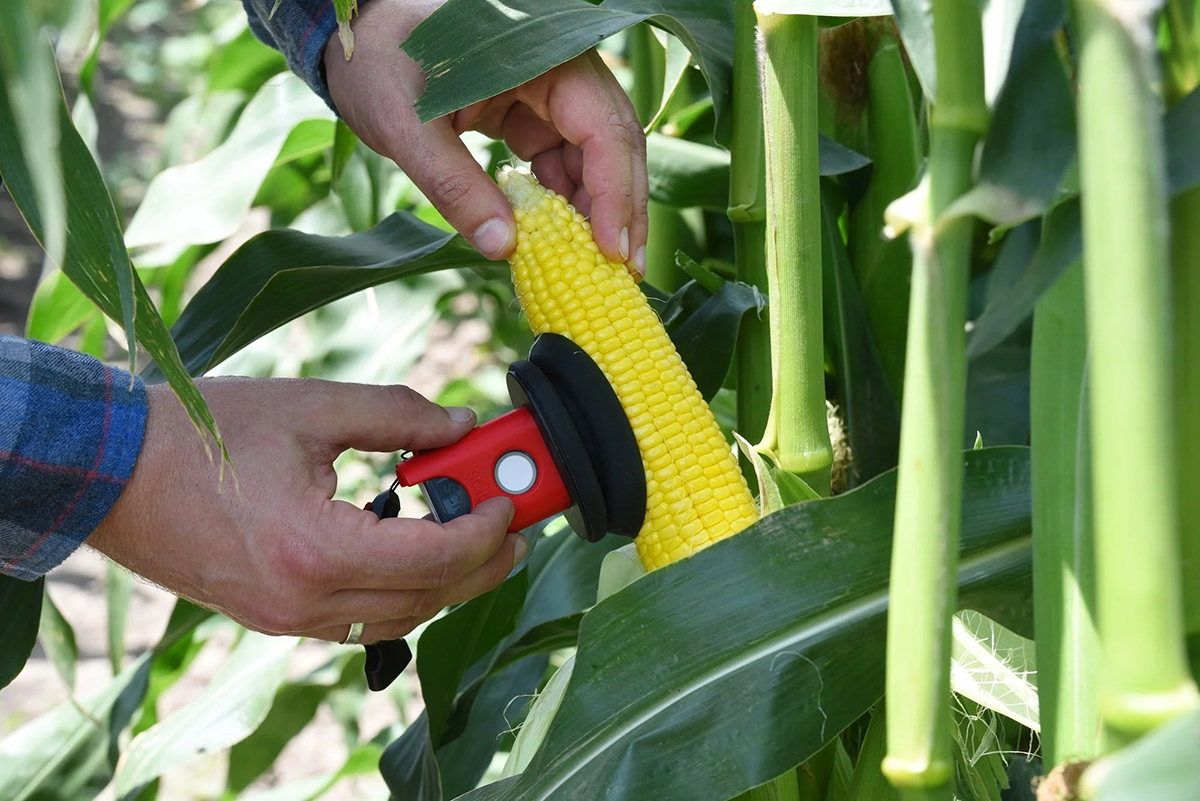 穂付きトウモロコシの粒水分を圃場で直接測定できるポータブル近赤外分析装置。