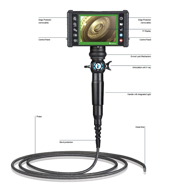 設備内部や配管、タービン、タンクなどの検査では、対象を分解せずに内部の状態を把握することが求められます。本製品は、そうした現場に対応するために設計されており、柔軟なプローブと可動式の先端により、狭く入り組んだ内部にもアプローチしながら視野を確保できます。