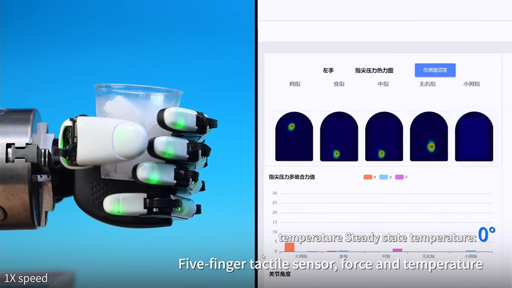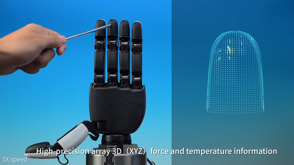全関節は独立かつバックドライブ可能な構造となっており、模倣学習や強化学習といったAIアルゴリズムの開発にも適しています。加えて、各指先には高解像度の触覚センサーが搭載されており、力覚・温度・接触・滑り・質感など、多彩な情報を高精度に取得できます。