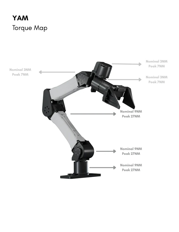 YAM Arm は、研究開発用途に設計された6自由度構成のロボットアームで、把持機構を含めた実機検証を行える統合型プラットフォームです。制御アルゴリズムの評価、マニピュレーション研究、教育用途など、実験環境での再現性と拡張性を重視する大学・企業の研究者に適しています。