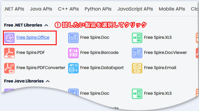 ①メーカーサイトの Products > Free Products から各製品の試用版フォームにアクセスできます。