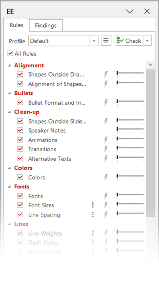 箇条書き、色・フォントの統一、スペースの過不足、不要なアニメーションの削除など、25以上のルールに基づき、資料の品質を確保します。