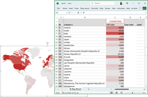Excelと連携して国ごとの色分けや条件付きフォーマットも可能で、データの視覚的な表現に優れた資料が作成できます。