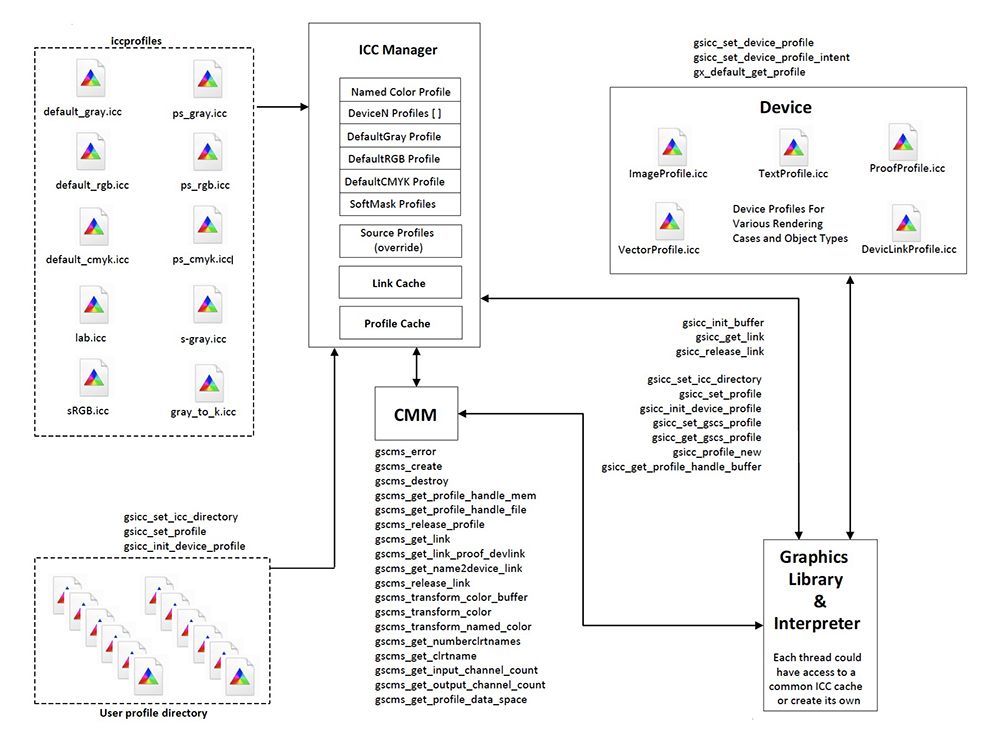文書の構造を正確に読み取り、画面表示や出力に適した形式へ処理できるため、PDFやPostScriptを扱うワークフローの基盤として利用できます。内部にはインタプリタ層とグラフィックスライブラリが備わり、これらを中心に文書処理を行う仕組みが構築されています。