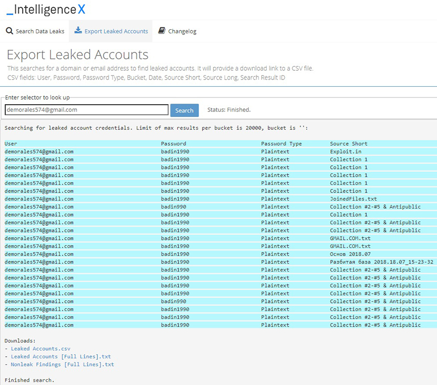 メールアドレスやドメイン、IPアドレス、URL、暗号資産アドレスなどのセレクターを起点に高度な検索を実行できる点が特長で、通常の検索エンジンでは到達できない領域の情報探索を可能にします。さらに、検索結果のダウンロードやAPI連携に対応しており、外部システムとの統合や調査プロセスの自動化にも活用できます。
