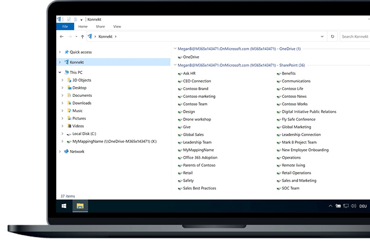 KONNEKT は、Microsoft 365 の SharePoint や OneDrive に保存されたファイルを、Windows のファイルエクスプローラーから直接扱えるようにするソフトウェアです。クラウド上のライブラリを PC のドライブとして表示できるため、ユーザーは普段のファイル操作と同じ感覚でクラウド上のデータにアクセスできます。