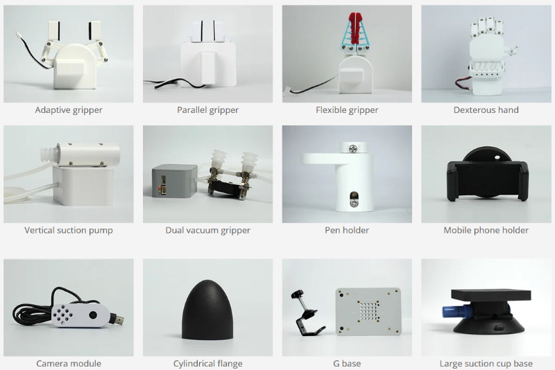 吸着グリッパー、電動グリッパー、カメラモジュール、ベルトコンベアなど、多彩なアクセサリにも対応しており、物体認識・自動仕分け・ピッキングなどの実践的なタスクも再現可能です。教育現場におけるロボット制御の学習から、産業用プロトタイプ開発まで、幅広い用途に対応します。