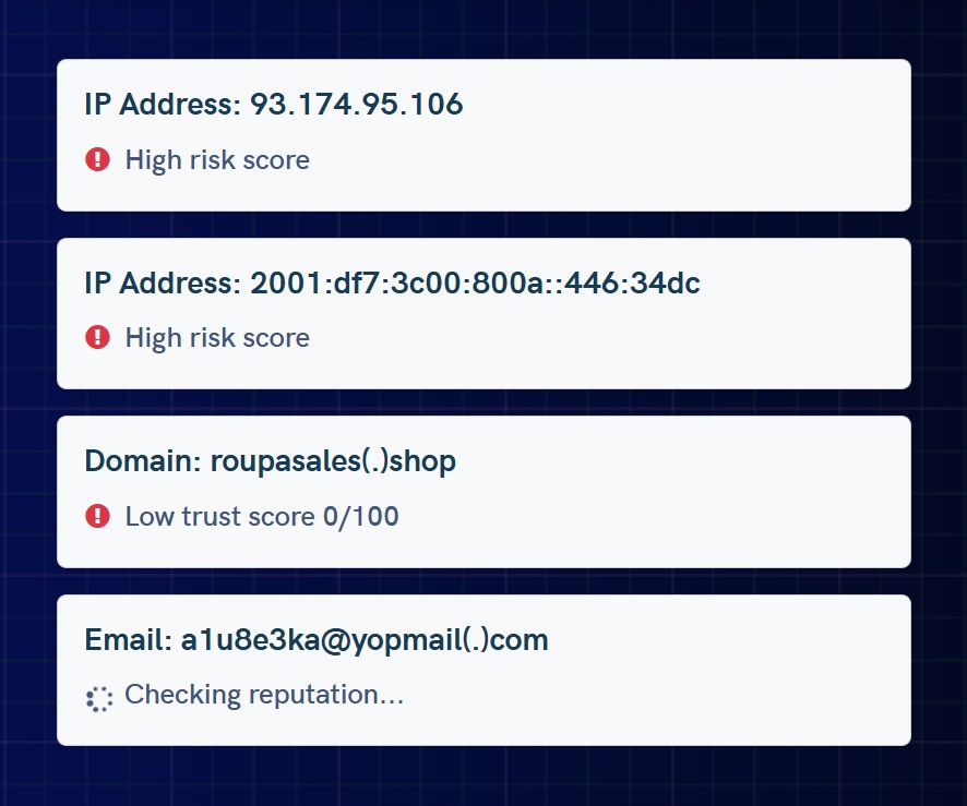 脅威インテリジェンスAPI / セキュリティAPI / IPレピュテーション / ドメインレピュテーション / URLレピュテーション / 外部脅威評価 / 不正アクセス対策 / 不正行為対策 / セキュリティ判断自動化 / APIセキュリティ / IP評価API / ドメイン評価API / URL安全性評価 / メール検証API / 電話番号検証API / サイバーセキュリティAPI / SIEM連携 / SOC運用支援 / リスク評価API / 不正検知API