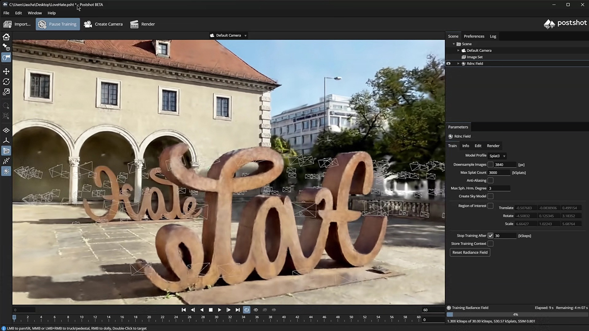 Postshot は、写真や動画から高精度な3Dシーンを自動生成し、編集からレンダリングまでを一貫して行える、AIベースの3D再構築、ニューラルレンダリングソフトウェアです。