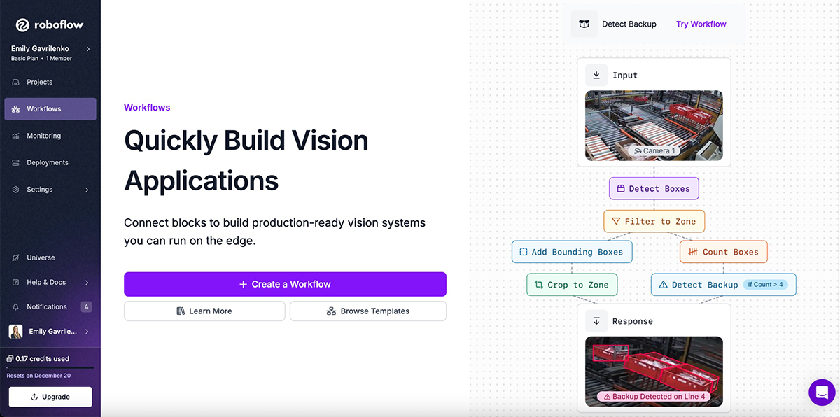 本製品の特長は、コンピュータビジョン開発に必要な作業を個別のツールに分けることなく、実践的なワークフローとしてまとめて扱える点です。研究段階で作成したデータセットやモデルを、そのまま検証や実運用につなげやすい構成となっており、APIやクラウド推論を通じて外部システムとの連携も可能です。
