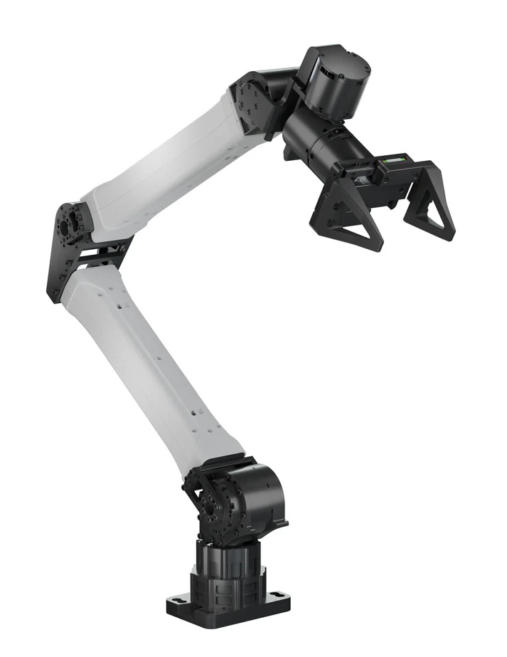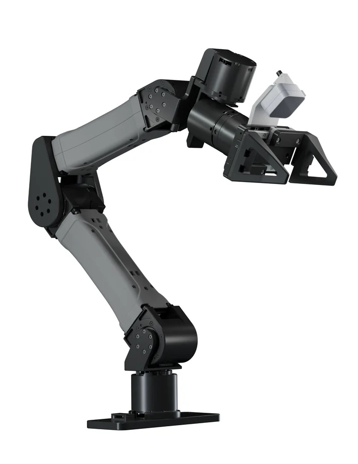 本体は6061アルミニウム合金をCNC加工した高剛性構造を採用しており、各関節にはクロスローラーベアリングを組み込むことで、安定した精密動作を実現しています。さらに、95mmストロークのグリッパーを標準搭載し、把持を伴う各種評価や制御検証を行うことが可能です。