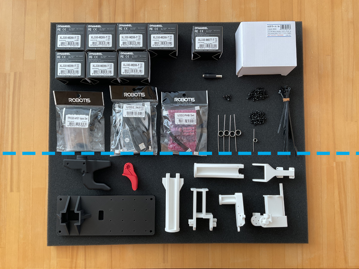 公開されているパーツリスト (BOM)や 3Dプリントパーツのデータをもとに、弊社でGello の製作に必要なパーツの調達 および プリントを致しました。